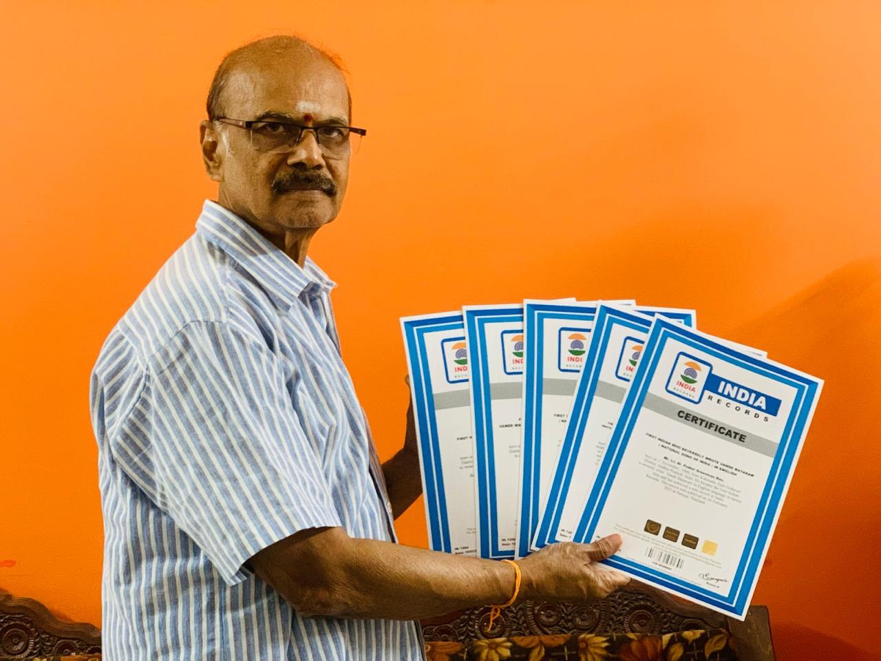 “MERA BHARAT MAHAN”. He has completed the art work in 22 X 28 inches size with Red, Blue, Green and Black gel pens in a week. 4000 (Four thousand) prints of this art in A4 size were done and laminated and distributed by August 15, 2025). He also distributed 200 glass frames and was done to keep framed tricolor flag in each & every house themed as “Every Home – National Flag”. The highlight of the photo framed tricolor flag artwork is that he has written names of the people who have sacrificed their life for the Country, at the bottom of the flag, so that it reminds everyone about them and also generates patriotic fervor towards the Country.
